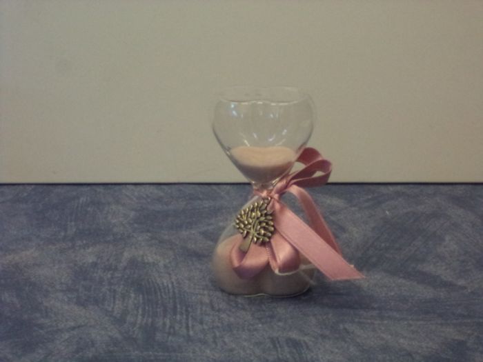 preziosissima ed utile bomboniera clessidra a forma di cuore in vetro con sabbia colorata alta cm 11,5