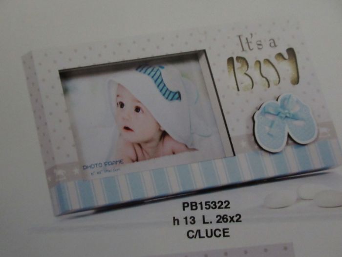 portafoto in legno con luci con scarpette celesti 26 cm. con luce