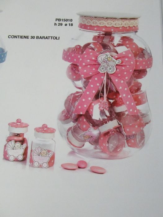 set barottolo in plastica con all′interno 30 barattoli piccoli rosa 29 cm.