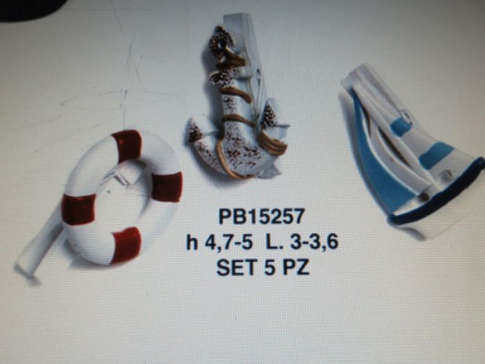 molletta ancora,barca e salvagente. in legno ed in resina set 5 pezzi 5 cm.