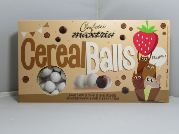confetti max tris golose palline di cereali al cacao ricoperto di cioccolato bianco al gusto di panna e fragola 400gr