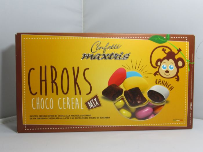 confetti max tris gustose cereali ripieni di crema alla nocciola ricoperti da un finissimo cioccolato al latte e un sottilissimo strato di zucchero 500gr