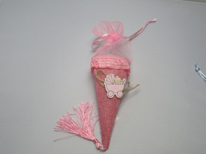sacchetto per confezionamento con carrozzella rosa 14 cm plastica e stoffa