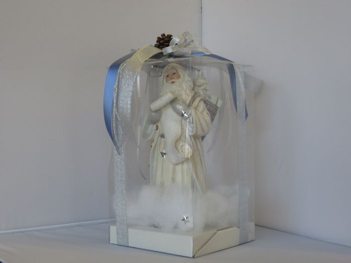 babbo natale imbiancato corredato di scatola trasparente e fiocchi alt cm 31