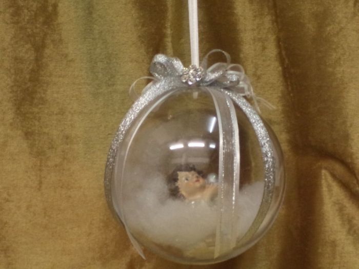 articolo natalizio raffinato per un natale personalizzato palla in plexigas diam. 38 con angelo seduto 6,3X5X7 resina pregiata argento