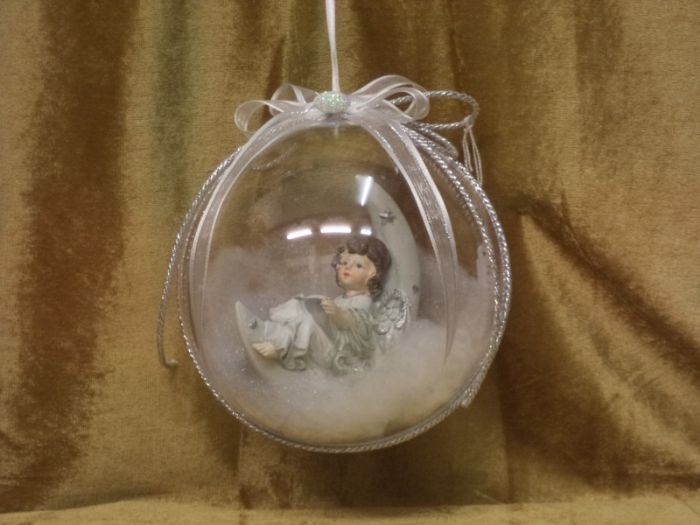 articolo natalizio raffinato per un natale personalizzato palla in plexigas diam. 50 con angelo seduto su mezza luna resina pregiata argento