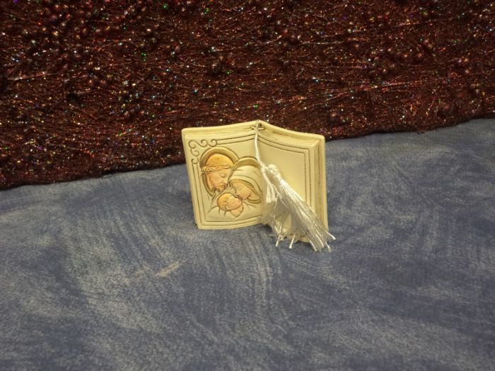 libro in resina pregiata con sacra famiglia alto 7 cm con nappina adatta per cerimonia