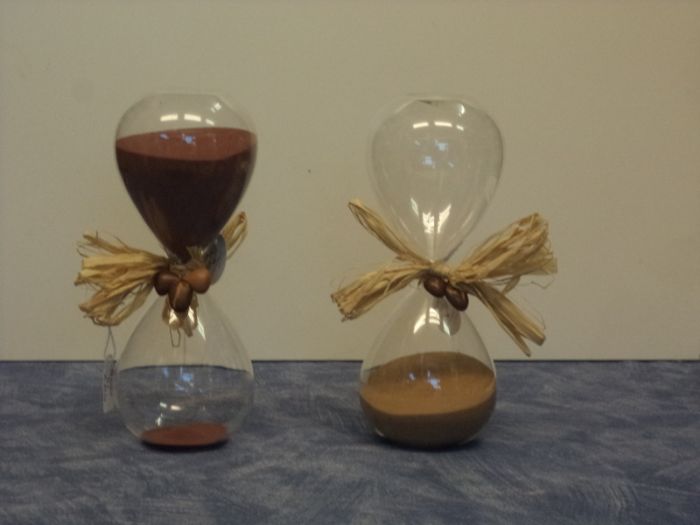preziosissima ed utile bomboniera clessidra caontry con chicco di caffe′ in vetro con sabbia colorata alta cm20,5 assortimento da due pezzi