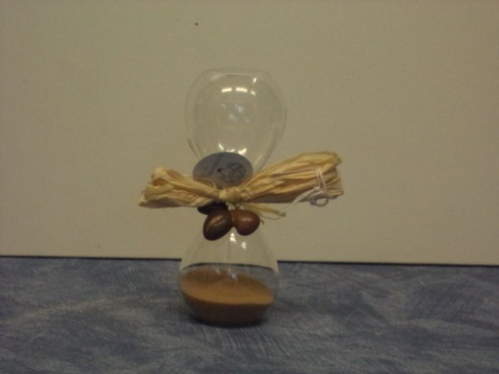 preziosissima ed utile bomboniera clessidra country con chicco di caffe′ in vetro con sabbia colorata alta cm 10,7 assortimento da 2 pezzi