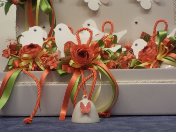articolo pasquale appendino con campana in porcellana e uccello in carta portaovetti decorato con nastri e cannella
