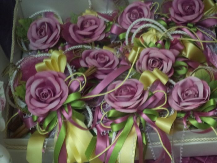 articolo pasquale appendino con rosa e portaconfetto a racchetta con nastri e cannella