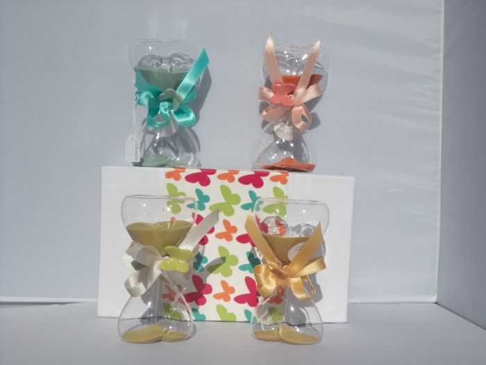clessidra in vetro piccola con fiocco e farfalla 11 cm. 4 assortimenti, prezzo singolo