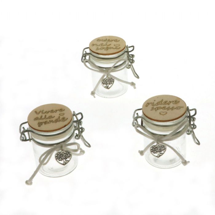 soffice barattolo vetro e legno con dedica h 6,5 cm assortimento da 3 pezzi prezzo cad.