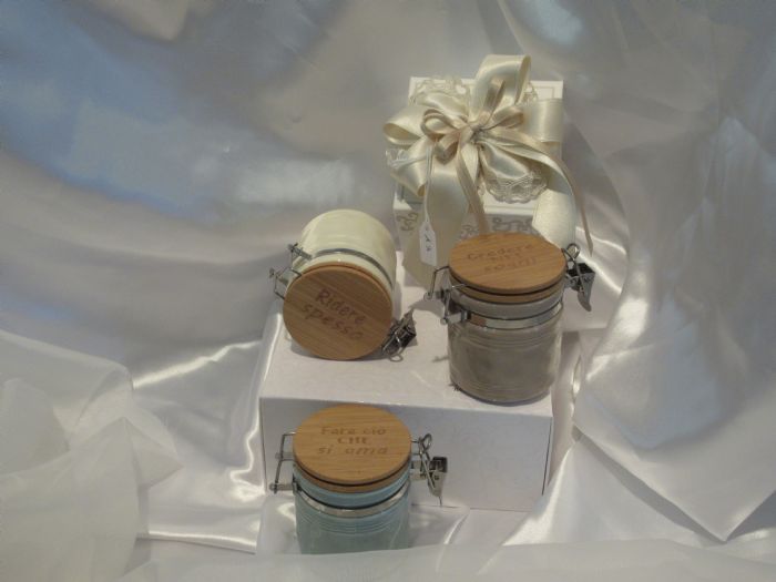 elegante bomboniera completa di sacchetto, scatola e rigorosamente nastro italiano con barattoli in ceramica con dedica cm 7,5