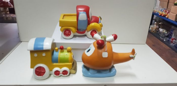 pregiata resina salvadanaio mezzi di trasporto cm 12 x 10 colre pastello elicottero camion, trenino,auto