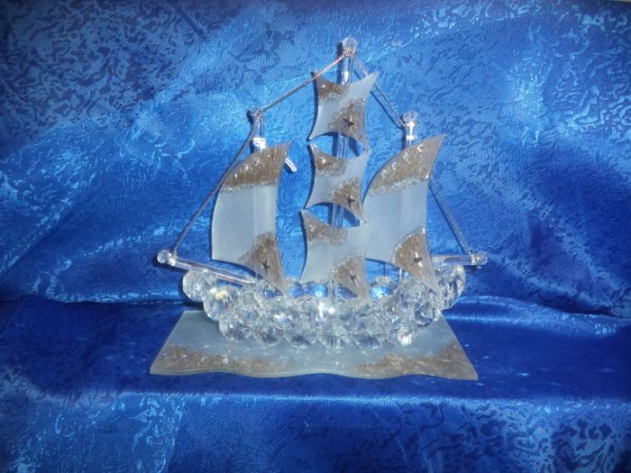 PREZIOSA BOMBONIERA IN CRISTALLO SWAROVSKI VELIERO CON5 VELE COLOR TORTORA LUNGA CM 21CM ALTA 20CM