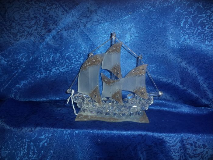 PREZIOSA BOMBONIERA IN CRISTALLO SWAROVSKI VELIERO CON 3 VELE COLOR TORTORA LUNGA CM 17CM ALTA 16CM
