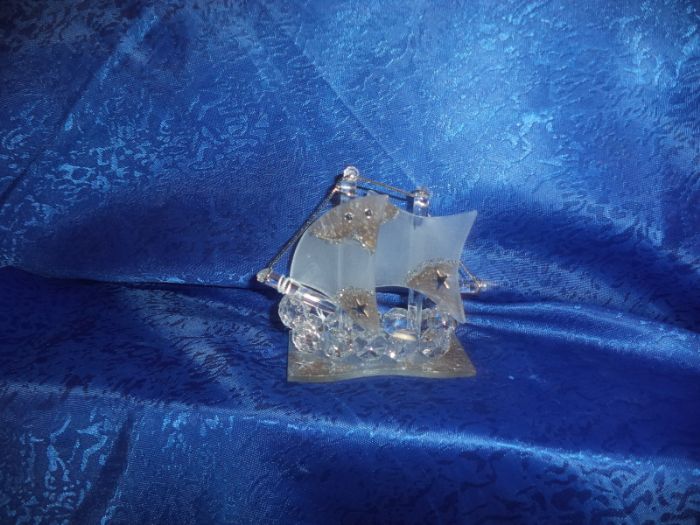 PREZIOSA BOMBONIERA IN CRISTALLO SWAROVSKI VELIERO CON2 VELE COLOR TORTORA LUNGA CM 11CM ALTA10CM