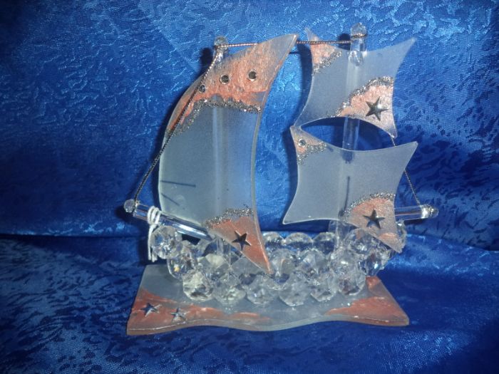 PREZIOSA BOMBONIERA IN CRISTALLO SWAROVSKI VELIERO CON3 VELE COLOR CIPRIA LUNGA CM 17CM ALTA 16CM