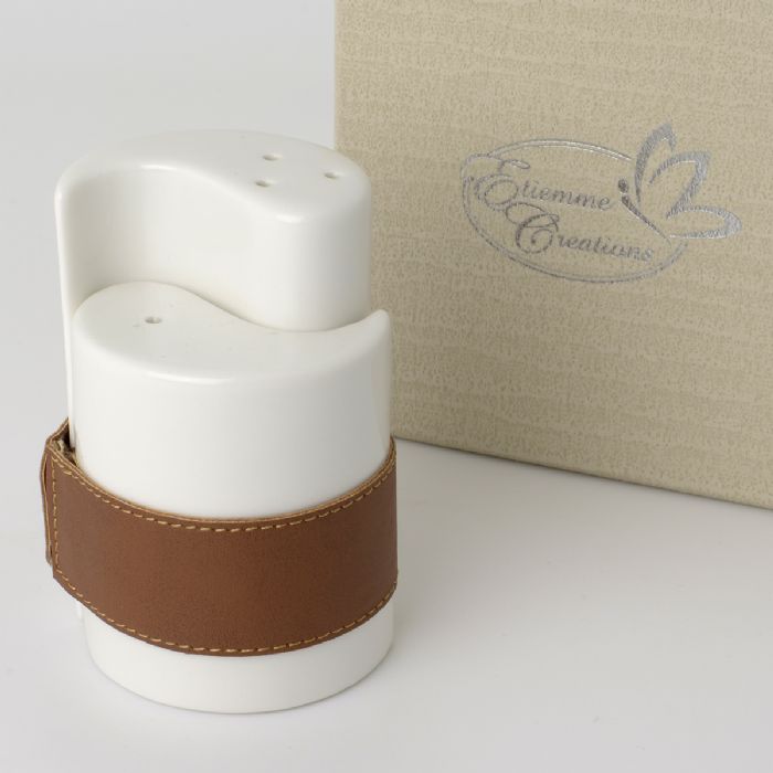 oggetti utili in porcellana con fascia in eco-pelle collezione fine set sale e pepe dm6 h 9 con scatola