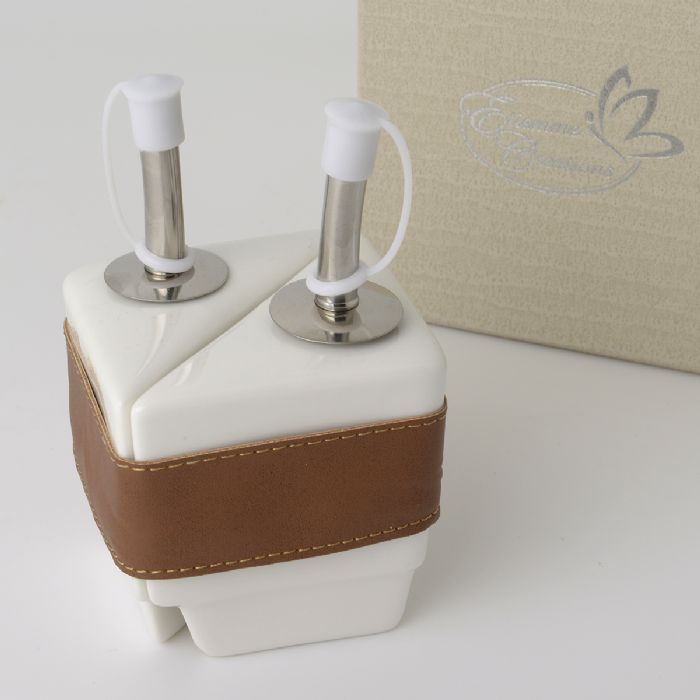 oggetti utili in porcellana con fascia in eco-pelle collezione fine set olio/aceto cm 7 h 10 con scatola