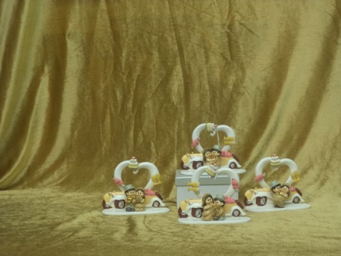 graziosa articolo in resina sposini in auto con torte,bicchierie cuori piccoli magnete cm 12x12 3 pezzi assortiti