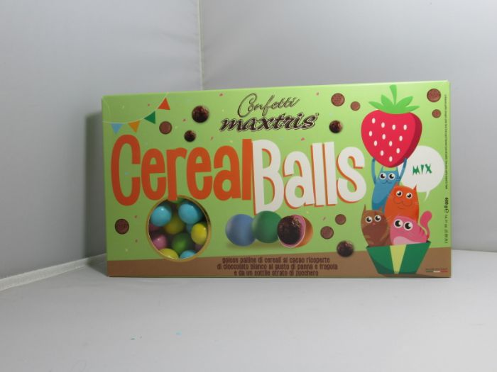 confetti max tris golose palline di cereali al cacao ricoperto di cioccolato bianco al gusto di panna e fragola e da sottile strato di zucchero 400gr